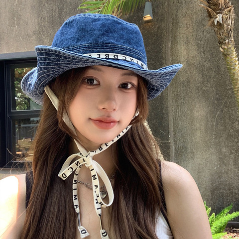 Casual verão pescador chapéu das mulheres All-Match exterior Caminhadas Hat Tie-Tie Design lavado alfabeto estilo Cowboy para a pesca do esqui